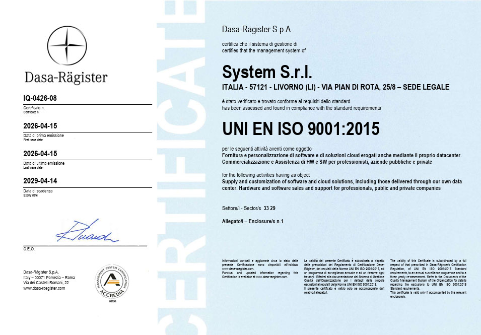 Siamo orgogliosi di annunciare che System S.r.l. ha ottenuto la certificazione UNI EN ISO 9001:2015, rilasciata da Dasa-Rägister S.p.A., uno dei principali enti di certificazione a livello internazionale.